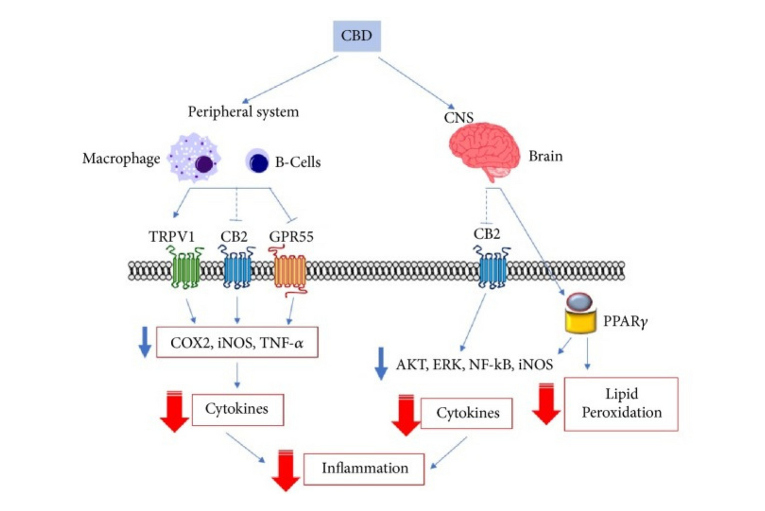 Tra i benefici del CBD “sono incluse le sue azioni antinfiammatorie in una varietà di modelli preclinici. Alcuni esempi sono la colite sperimentale, l'artrite indotta dal collagene, la neuroinfiammazione indotta da β-amiloide, la chemiotassi dei neutrofili, il danno da ischemia-riperfusione (I/R) epatico, le malattie autoimmuni”